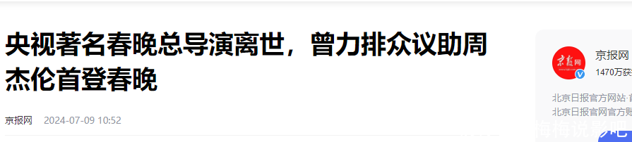 参考信源:京报网——《央视知名春晚总导演离世,曾不由分说协助周杰伦首登春晚》——2024-07-09