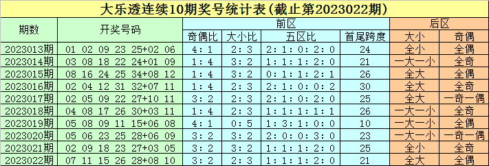 上期纪念:体彩大乐透第2023022期开出奖号:07 11 15 26 28 + 08 10。其中前区奖号奇偶比为3:2,大小比为2:3太阳城娱乐,五区比为1:1:1:2:0,跨度为21。后区奖号大小比为2:0,奇偶比为0:2。