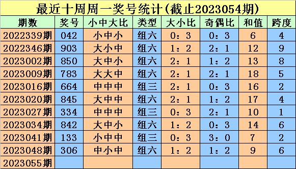 奖号类型判断:近期周一组六明显活跃,近十周开出7次,上周一为组六,组三出现较少,本周一看好在组六。